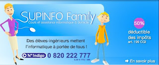 “SUPINFO Family est un service de cours et d’assistance informatique à domicile apporté par SUPINFO, l’Ecole d’informatique leader en France. Ce service est destiné aux juniors, adultes et seniors et convient donc à toute la famille. Il sera progressivement accessible partout en France et dans les départements d’outre-mer. SUPINFO Family s’inscrit dans le cadre réglementé des services à la personne ce qui veut dire que 50% du coût total du service est déductible des impôts, dans les conditions fixées par la loi .”